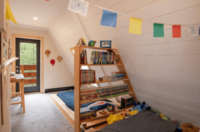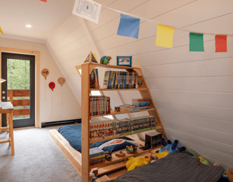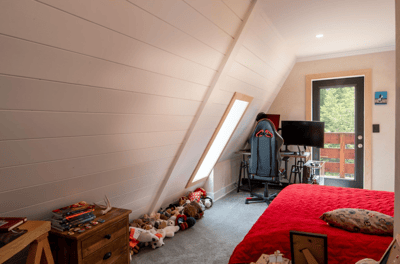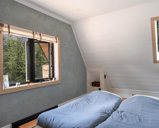 Chambre avec lit double , chambre enfant à l'étage avec fenêtre.