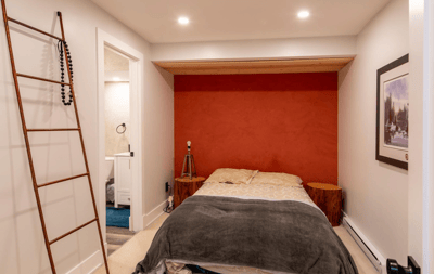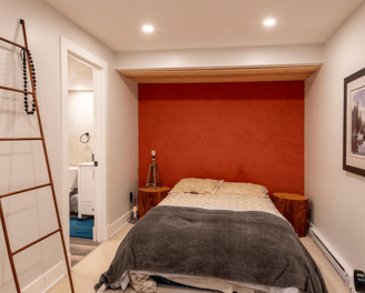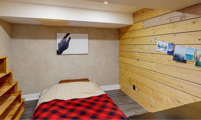 Chambre au sous sol avec un lit double.